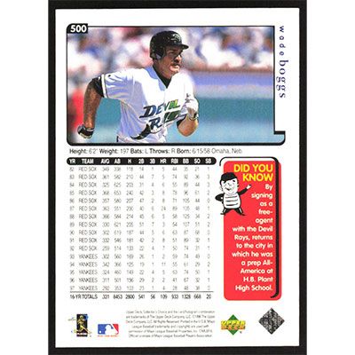 This is a 1998 Collector's Choice Wade Boggs baseball card. The card is #500 and pictures show condition.