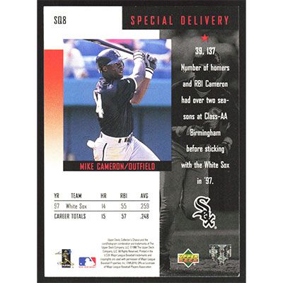 This is a 1998 Collector's Choice StarQuest Mike Cameron baseball card. The card is #SQ8 and pictures show condition.