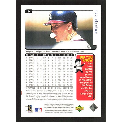This is a 1998 Collector's Choice Team Set Tom Glavine baseball card. The card is #6 and pictures show condition.