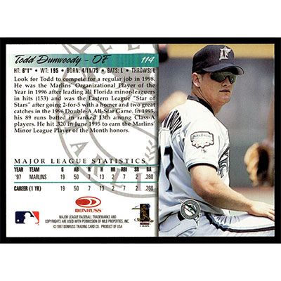 This is a 1998 Donruss Todd Dunwoody baseball card. The card is #114 and pictures show condition.
