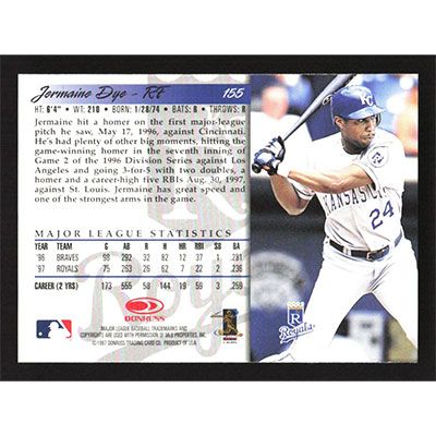 This is a 1998 Donruss Jermaine Dye baseball card. The card is #155 and pictures show condition.
