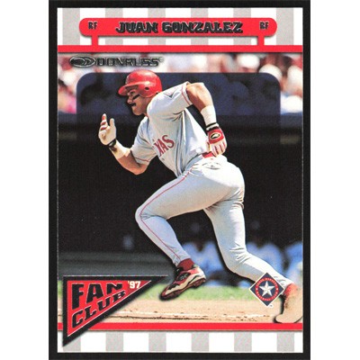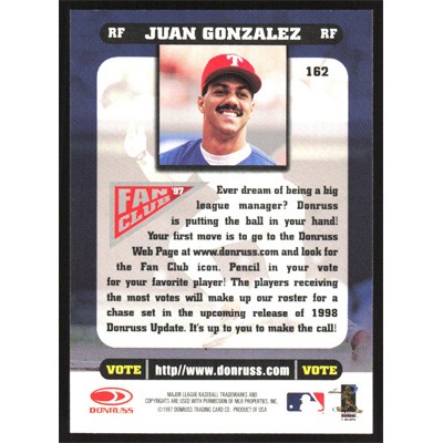 This is a 1998 Donruss Juan Gonzalez Fan Club '97 baseball card. The card is #162 and pictures show condition.