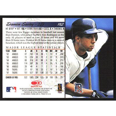 This is a 1998 Donruss Damion Easley baseball card. The card is #182 and pictures show condition.