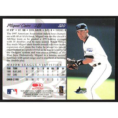 This is a 1998 Donruss Miguel Cairo baseball card. The card is #320 and pictures show condition.