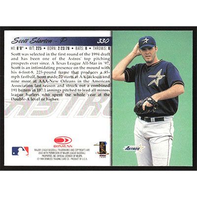 This is a 1998 Donruss Scott Elarton baseball card. The card is #330 and pictures show condition.