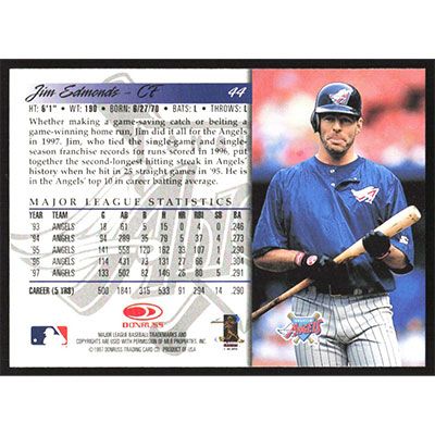 This is a 1998 Donruss Jim Edmonds baseball card. The card is #44 and pictures show condition.