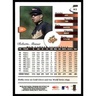 This is a 1998 Donruss Signature Roberto Alomar baseball card. The card is #83 and pictures show condition.