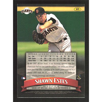 This is a 1998 Finest Shawn Estes baseball card. The card is #123 and pictures show condition.