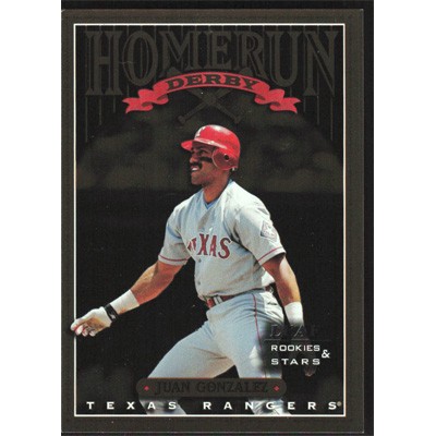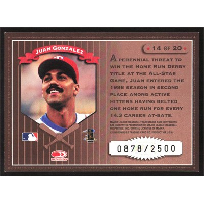 This is a 1998 Leaf Rookies & Stars Home Run Derby Juan Gonzalez baseball card. The card is #14 and pictures show condition. This card is limited; #'d 0878/2500.