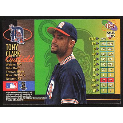 This is a 1998 Metal Universe Tony Clark baseball card. The card is #184 and pictures show condition.