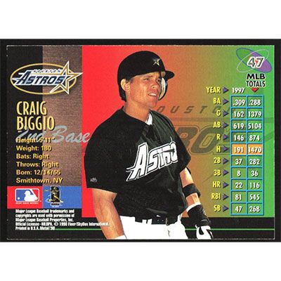 This is a 1998 Metal Universe Craig Biggio baseball card. The card is #47 and pictures show condition.
