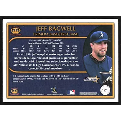 This is a 1998 Pacific Crown Collection Jeff Bagwell baseball card. The card is #121 and pictures show condition.
