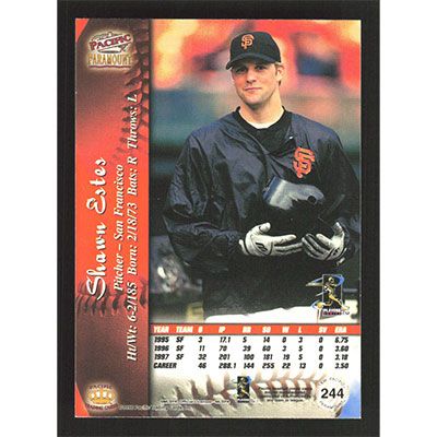 This is a 1998 Paramount Shawn Estes baseball card. The card is #244 and pictures show condition.