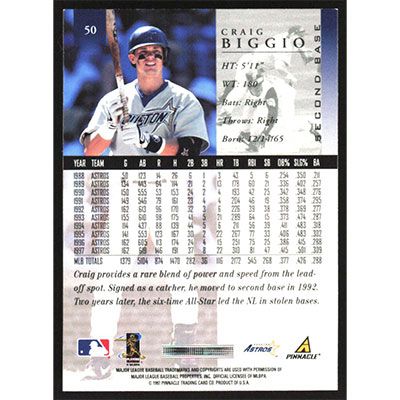 This is a 1998 Pinnacle Craig Biggio baseball card. The card is #50 and pictures show condition.