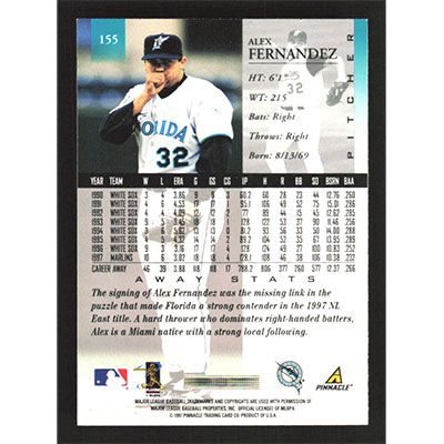This is a 1998 Pinnacle Away Stats Back Alex Fernandez baseball card. The card is #155 and pictures show condition.
