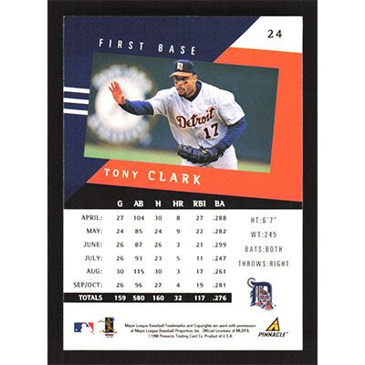 This is a 1998 Pinnacle Performers Tony Clark baseball card. The card is #24 and pictures show condition.