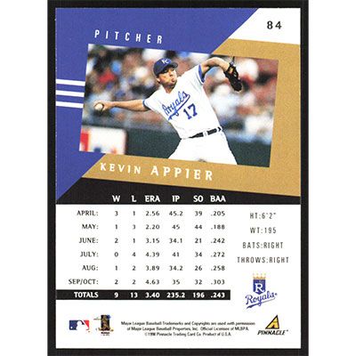 This is a 1998 Pinnacle Performers Kevin Appier baseball card. The card is #84 and pictures show condition.