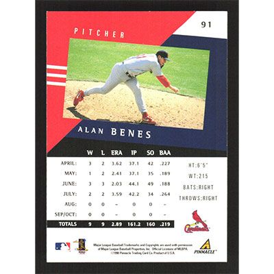 This is a 1998 Pinnacle Performers Alan Benes baseball card. The card is #91 and pictures show condition.