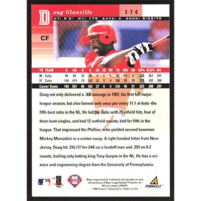 This is a 1998 Pinnacle Plus Doug Glanville baseball card. The card is #174 and pictures show condition.