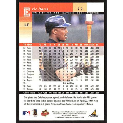 This is a 1998 Pinnacle Plus Eric Davis baseball card. The card is #77 and pictures show condition.