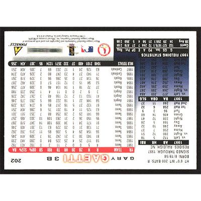 This is a 1998 Score Gary Gaetti baseball card. The card is #202 and pictures show condition.