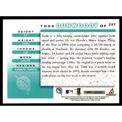 This is a 1998 Score Todd Dunwoody baseball card. The card is #237 and pictures show condition.