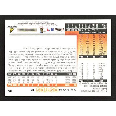 This is a 1998 Score Shawn Estes baseball card. The card is #35 and pictures show condition.