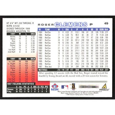 This is a 1998 Score Roger Clemens baseball card. The card is #49 and pictures show condition.