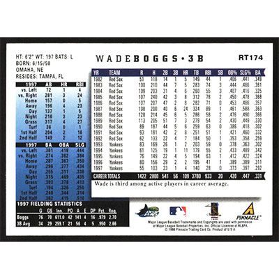 This is a 1998 Score Rookie Traded Wade Boggs baseball card. The card is #RT174 and pictures show condition.