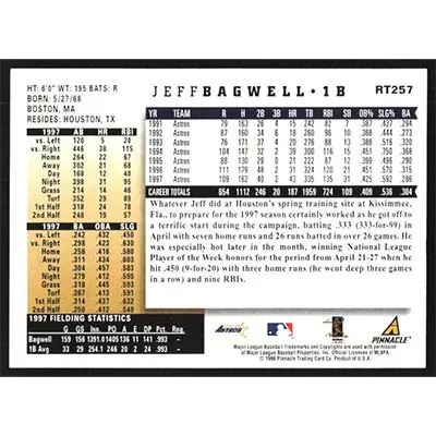 This is a 1998 Score Rookie Traded Jeff Bagwell Spring Training baseball card. The card is #RT257 and pictures show condition.