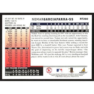 This is a 1998 Score Rookie Traded Nomar Garciaparra Spring Training baseball card. The card is #RT260 and pictures show condition. Team(s): Boston Red Sox
