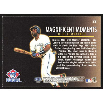 This is a 1998 Sports Illustrated World Series Fever Joe Carter Magnificent Moments baseball card. The card is #22 and pictures show condition. Team(s): Toronto Blue Jays