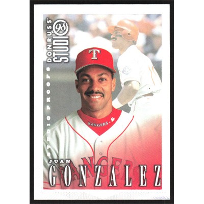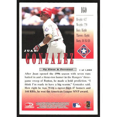 This is a 1998 Studio Silver Press Proofs Juan Gonzalez baseball card. The card is #160 and pictures show condition. This card is limited; #'d /1000. Team(s): Texas Rangers