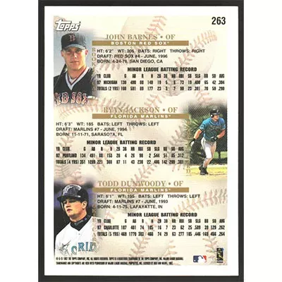 This is a 1998 Topps John Barnes, Ryan Jackson and Todd Dunwoody baseball card. The card is #263 and pictures show condition. Team(s): Boston Red/Florida Marlins Rookie Card (RC)