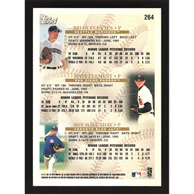 This is a 1998 Topps Brian Fuentes, Matt Clement and Roy Halladay Prospects baseball card. The card is #264 and pictures show condition. Team(s): Seattle Mariners/San Diego Padres/Toronto Blue Jays Rookie Card (RC)