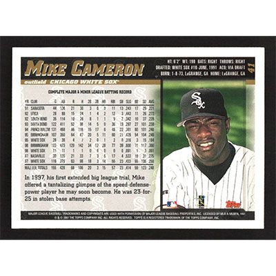 This is a 1998 Topps Mike Cameron baseball card. The card is #41 and pictures show condition.