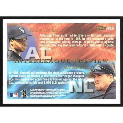 This is a 1998 Topps Jeff Bagwell and Frank Thomas Interleague Preview baseball card. The card is #480 and pictures show condition. Team(s): Houston Astros/Chicago White Sox