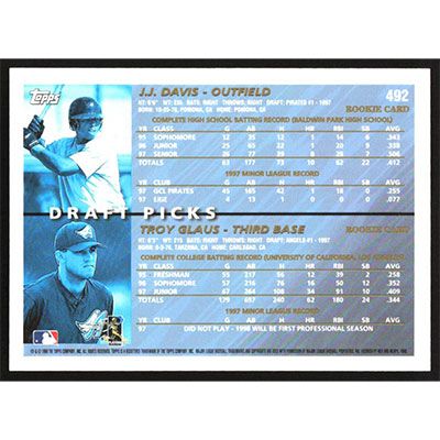 This is a 1998 Topps J.J. Davis/Troy Glaus Draft Picks baseball card. The card is #492 and pictures show condition. Team(s): Pittsburgh Pirates/Anaheim Angels Rookie Card (RC)