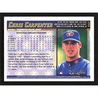 This is a 1998 Topps Chrome Chris Carpenter baseball card. The card is #442 and pictures show condition.