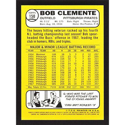 This is a 1998 Topps Clemente Roberto Clemente 1968 baseball card. The card is #14 and pictures show condition.
