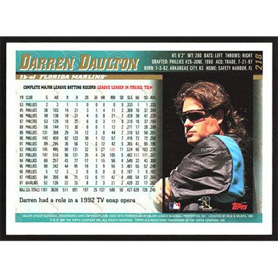 This is a 1998 Topps Minted in Cooperstown Darren Daulton baseball card. The card is #218 and pictures show condition.