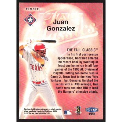 This is a 1998 Ultra Fall Classics Juan Gonzalez baseball card. The card is #11 and pictures show condition.