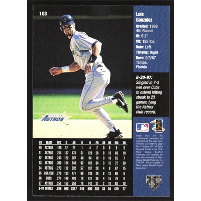 This is a 1998 Upper Deck Luis Gonzalez baseball card. The card is #103 and pictures show condition.