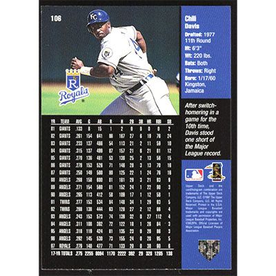This is a 1998 Upper Deck Chili Davis baseball card. The card is #106 and pictures show condition.