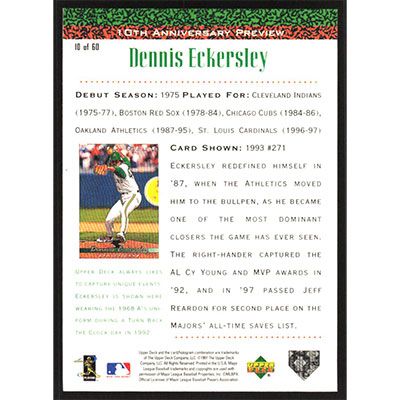 This is a 1998 Upper Deck 10th Anniversary Preview Retail Dennis Eckersley baseball card. The card is #10 and pictures show condition. Team(s): St. Louis Cardinals