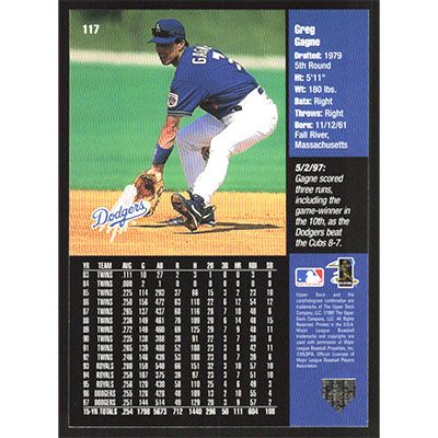This is a 1998 Upper Deck Greg Gagne baseball card. The card is #117 and pictures show condition.