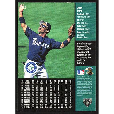 This is a 1998 Upper Deck Joey Cora baseball card. The card is #222 and pictures show condition.