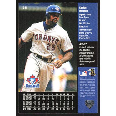 This is a 1998 Upper Deck Carlos Delgado baseball card. The card is #241 and pictures show condition.