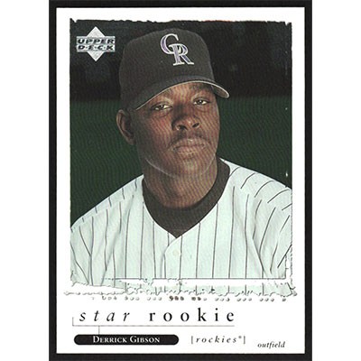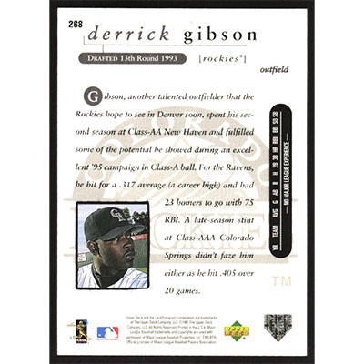 This is a 1998 Upper Deck Derrick Gibson Star Rookie baseball card. The card is #268 and pictures show condition.