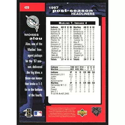 This is a 1998 Upper Deck Moises Alou Postseason Highlights baseball card. The card is #426 and pictures show condition.